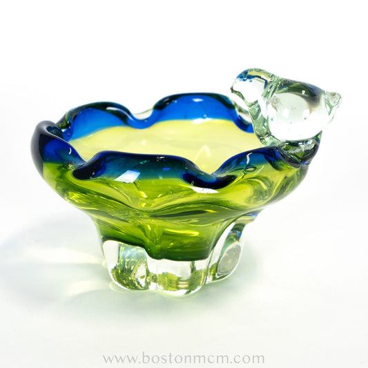 European Art Glass Green-Blue Bowl with Ornamental Glass Bird
