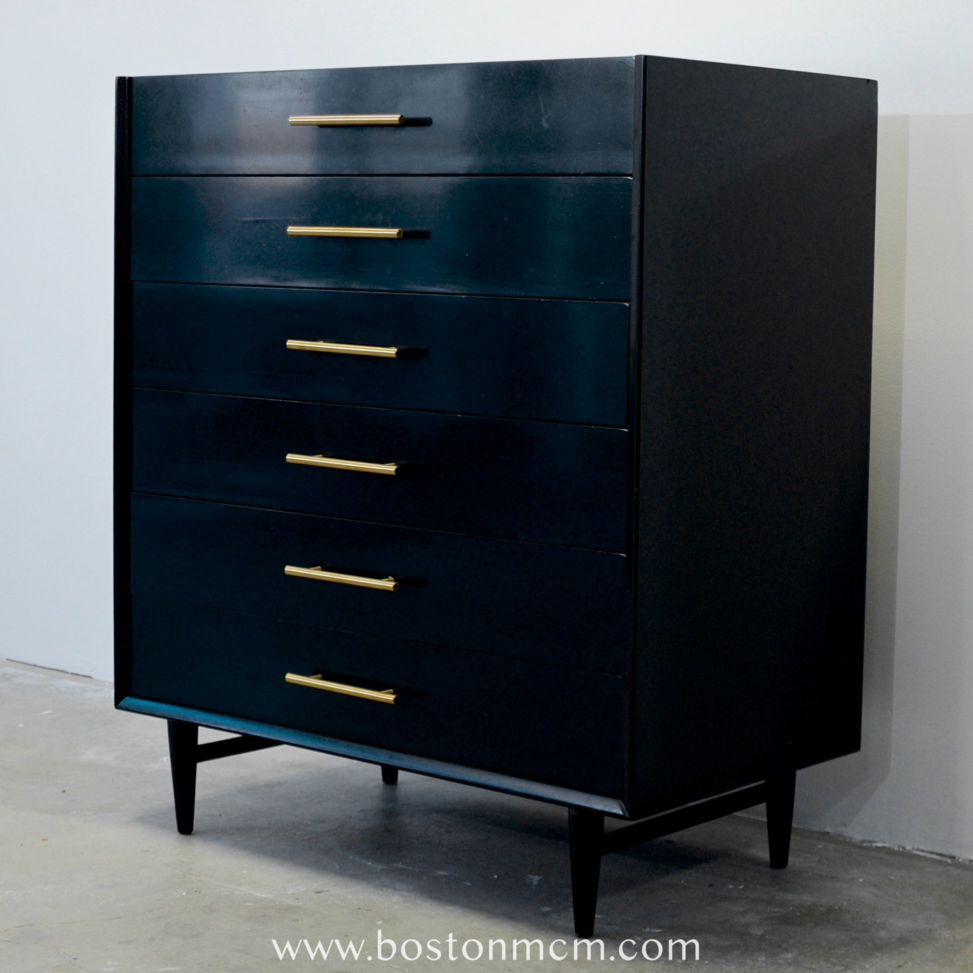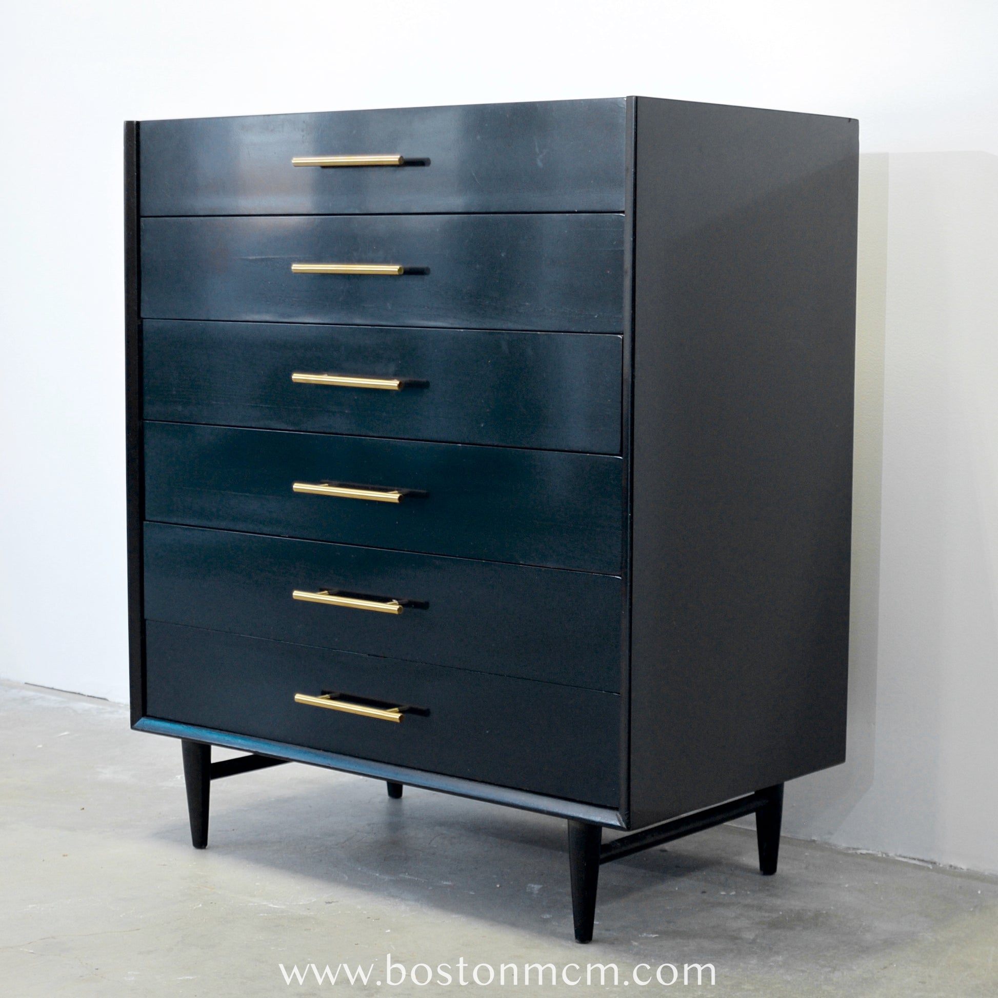 The "Silhouette" line was produced by American of Martinsville. Designed by Merton Gershun, it features jet-black glossy lacquer finish with white tops. This piece has been professionally restored. The handles are new solid brass as the original handles were missing.