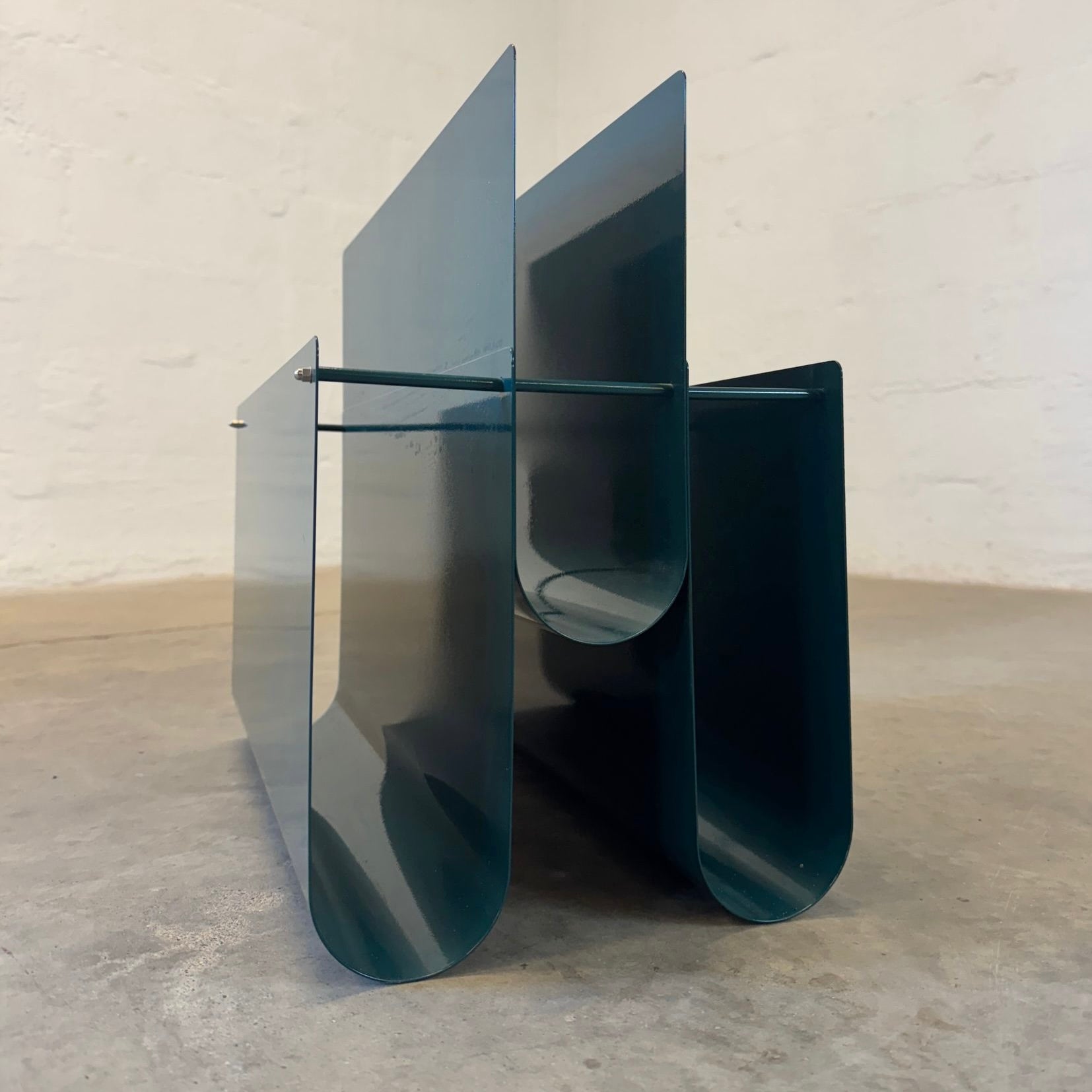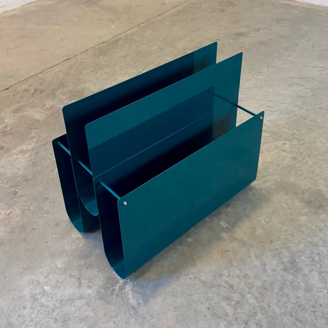 Details: Sometimes you just need storage for your magazines or books — with a pop of color! This bent metal piece is vintage and was imported from Denmark.