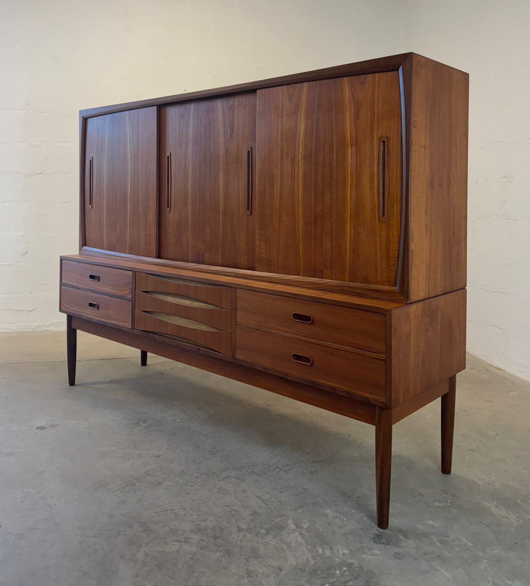 Details: This highboard has three large sliding doors, some curved details, and lower central drawers reminiscent of Arne Vodder’s work for Sibast. Unfortunately, we cannot positively ID the designer or manufacturer of this beautiful piece.
