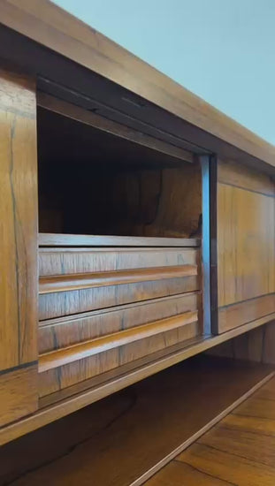 Details: Erling Torvits designed for several different manufacturers and would incorporate clever features such as the hidden shelf in this piece – can you find it? This desk was made in teak and rosewood; this piece has particularly beautiful grain.