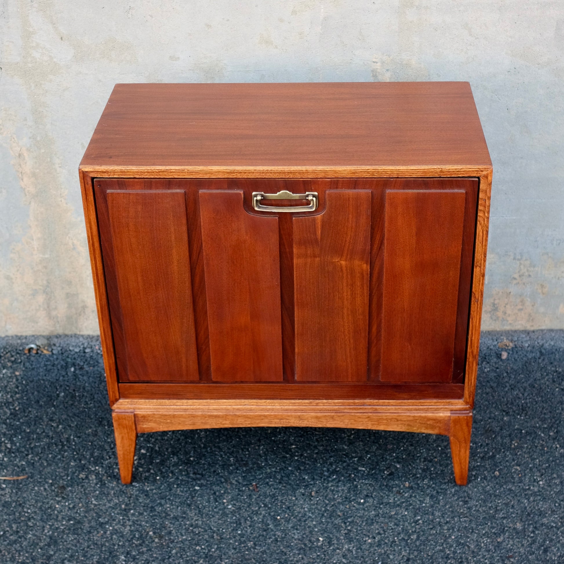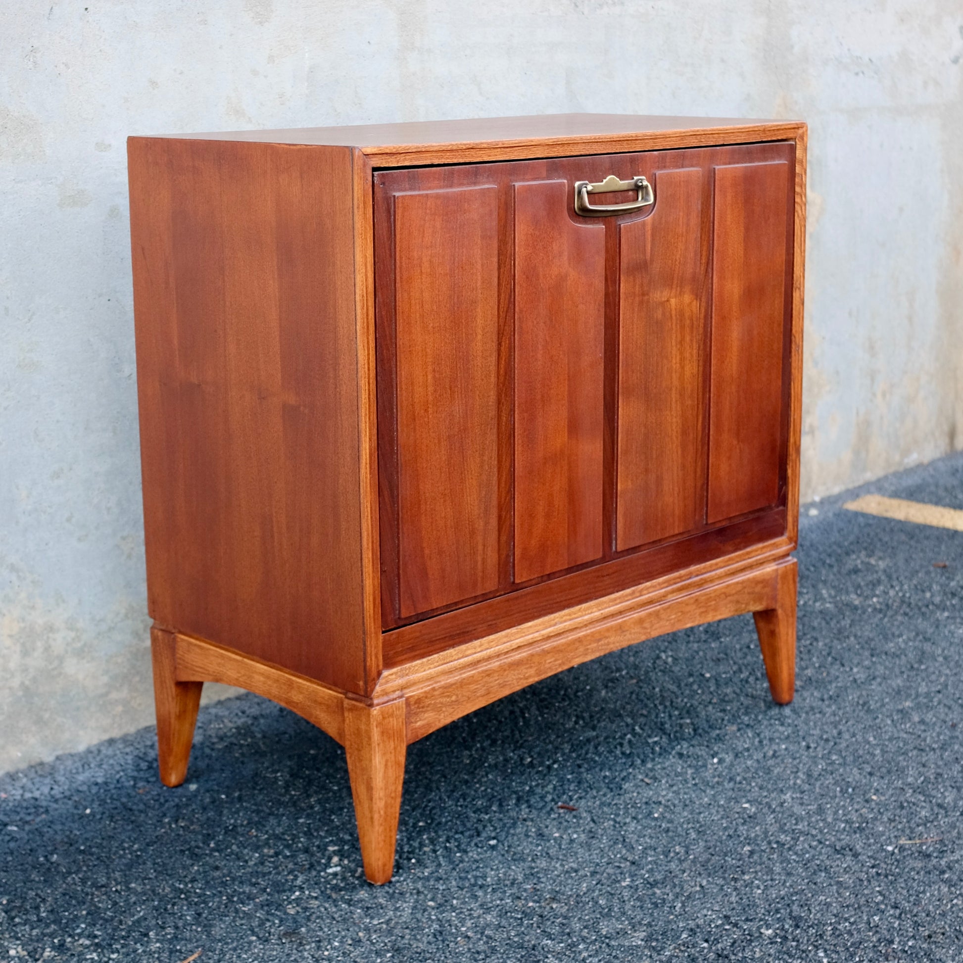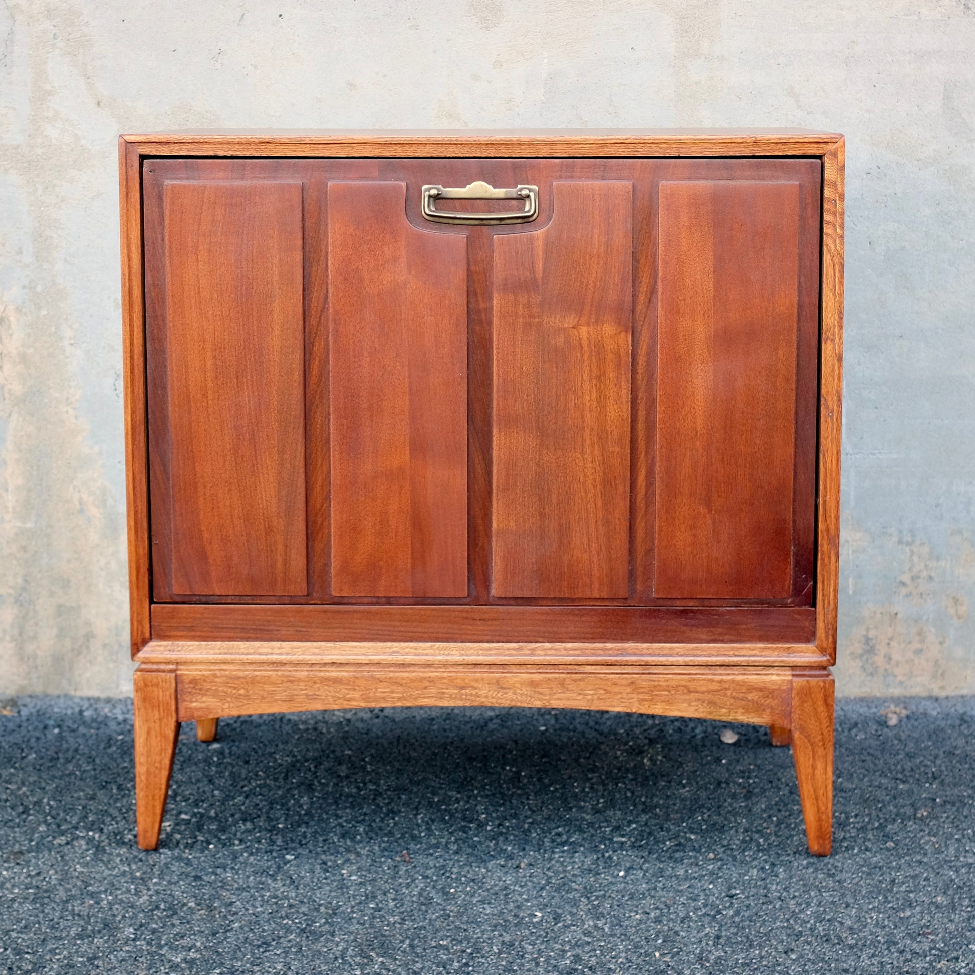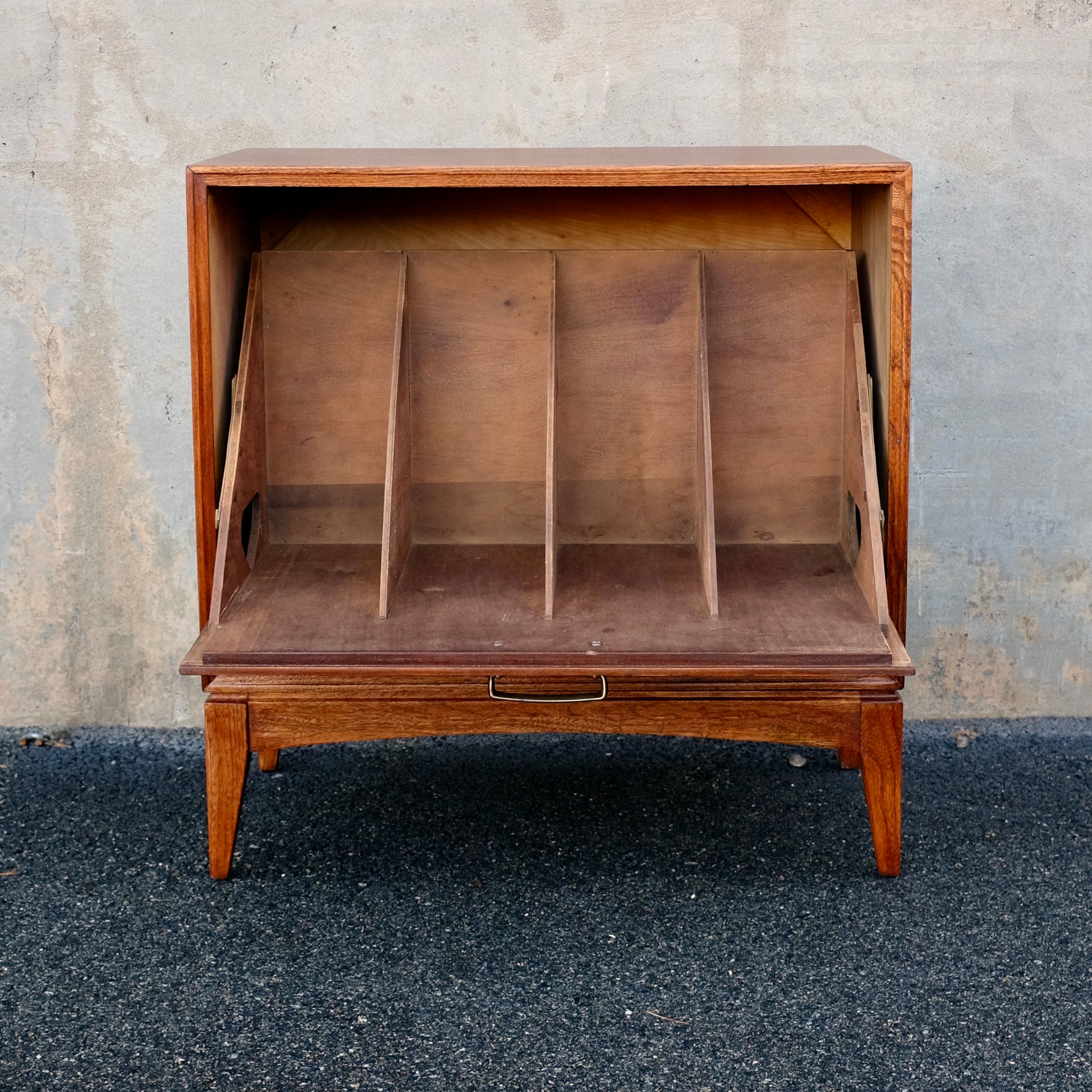 This Lane Furniture record cabinet tilts down on specialized hinges. It is perfectly sized to hold a turntable on top.