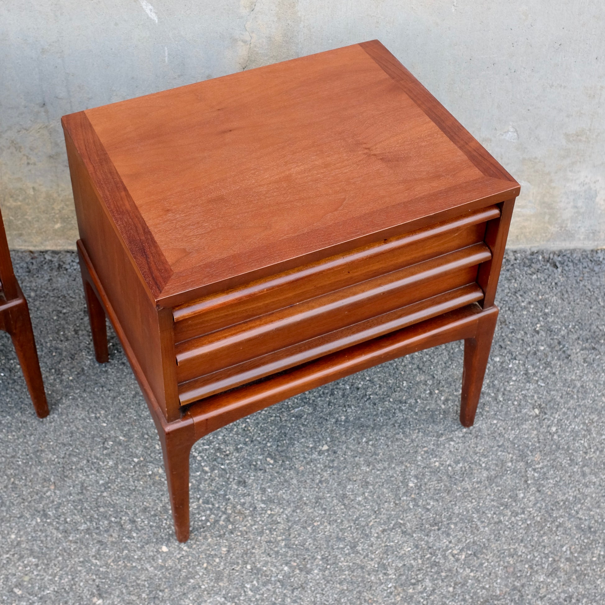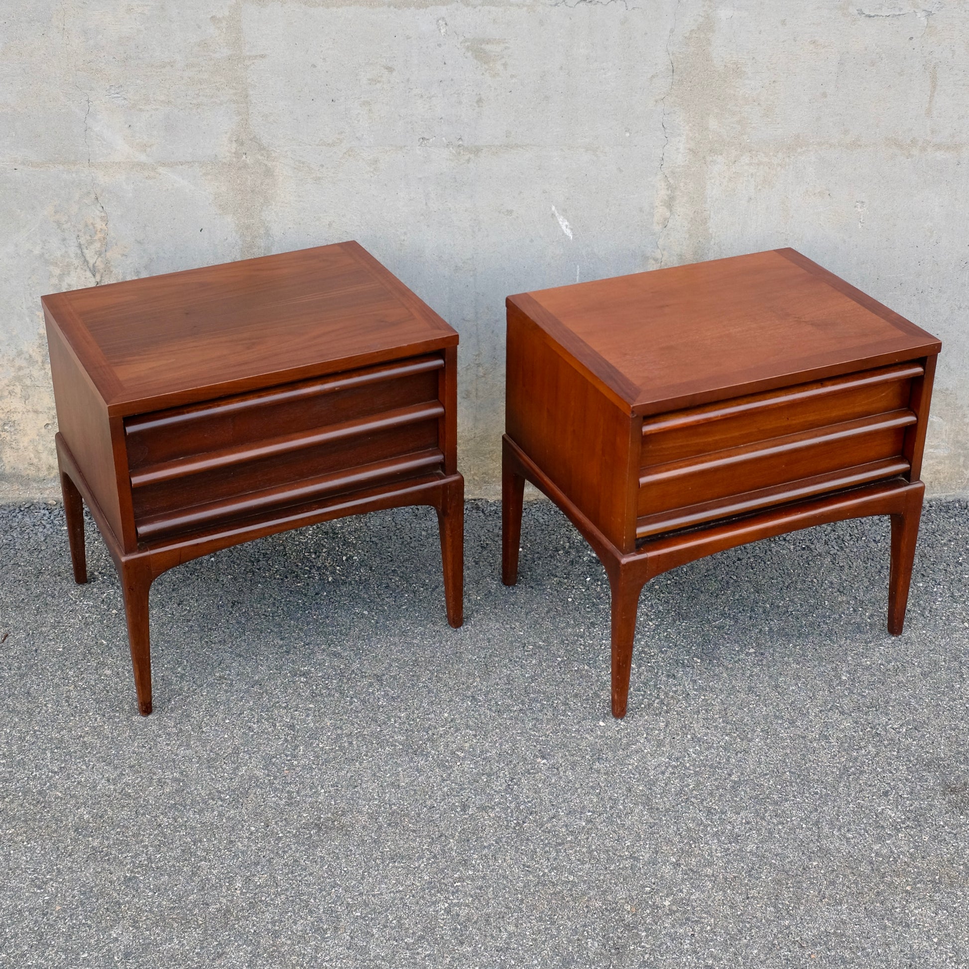 A pair of Lane "Rhythm" nightstands. These each have one large storage drawer on m metal glides. The walnut grain is beautiful and the slender legs make these a standout pair.
