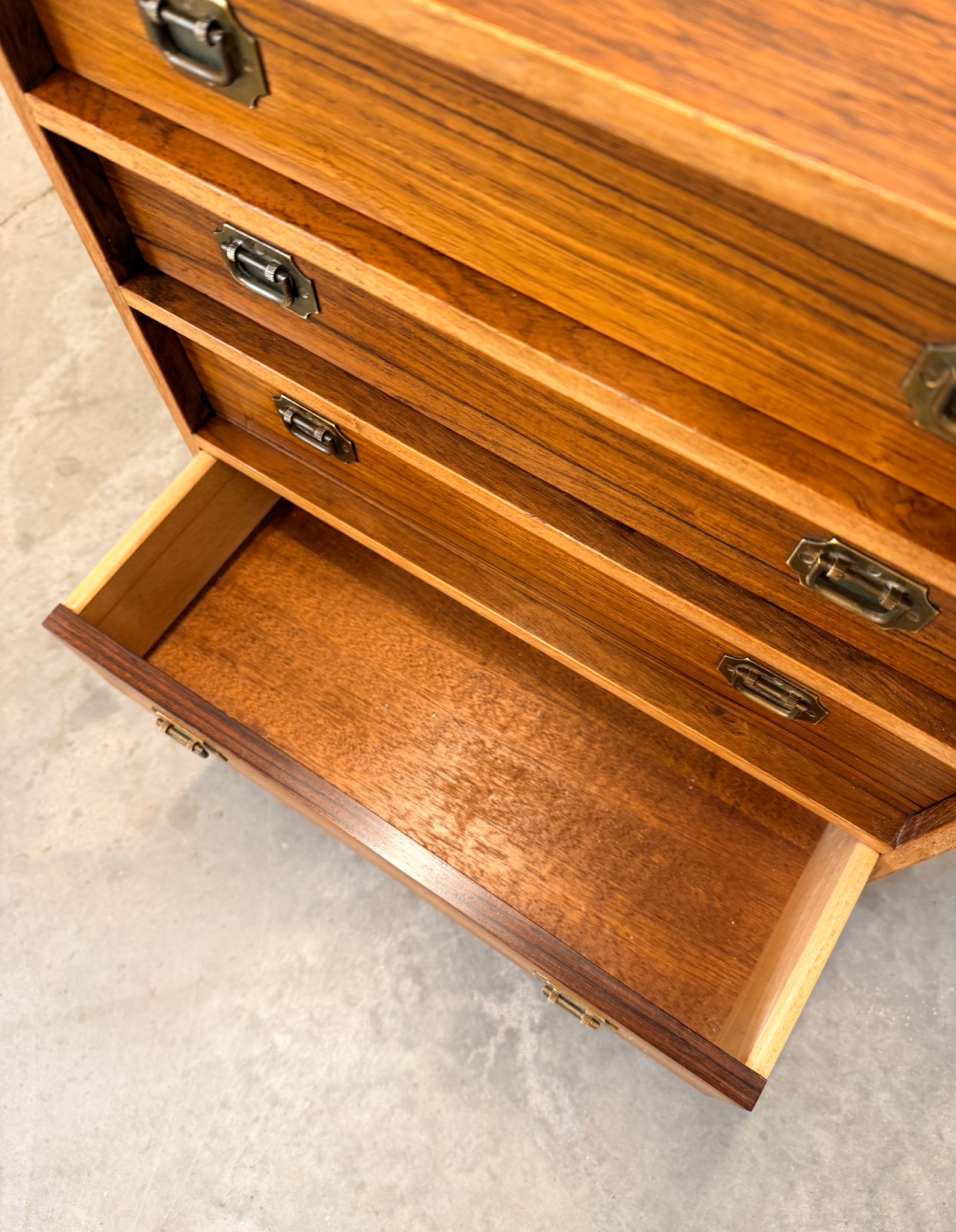 Details: Korch is not particularly well-known, but his modernist take on campaign-style furniture is popular and high quality. This piece is from the “Alabama” line and was sold as a nightstand or small dresser. Professionally restored.