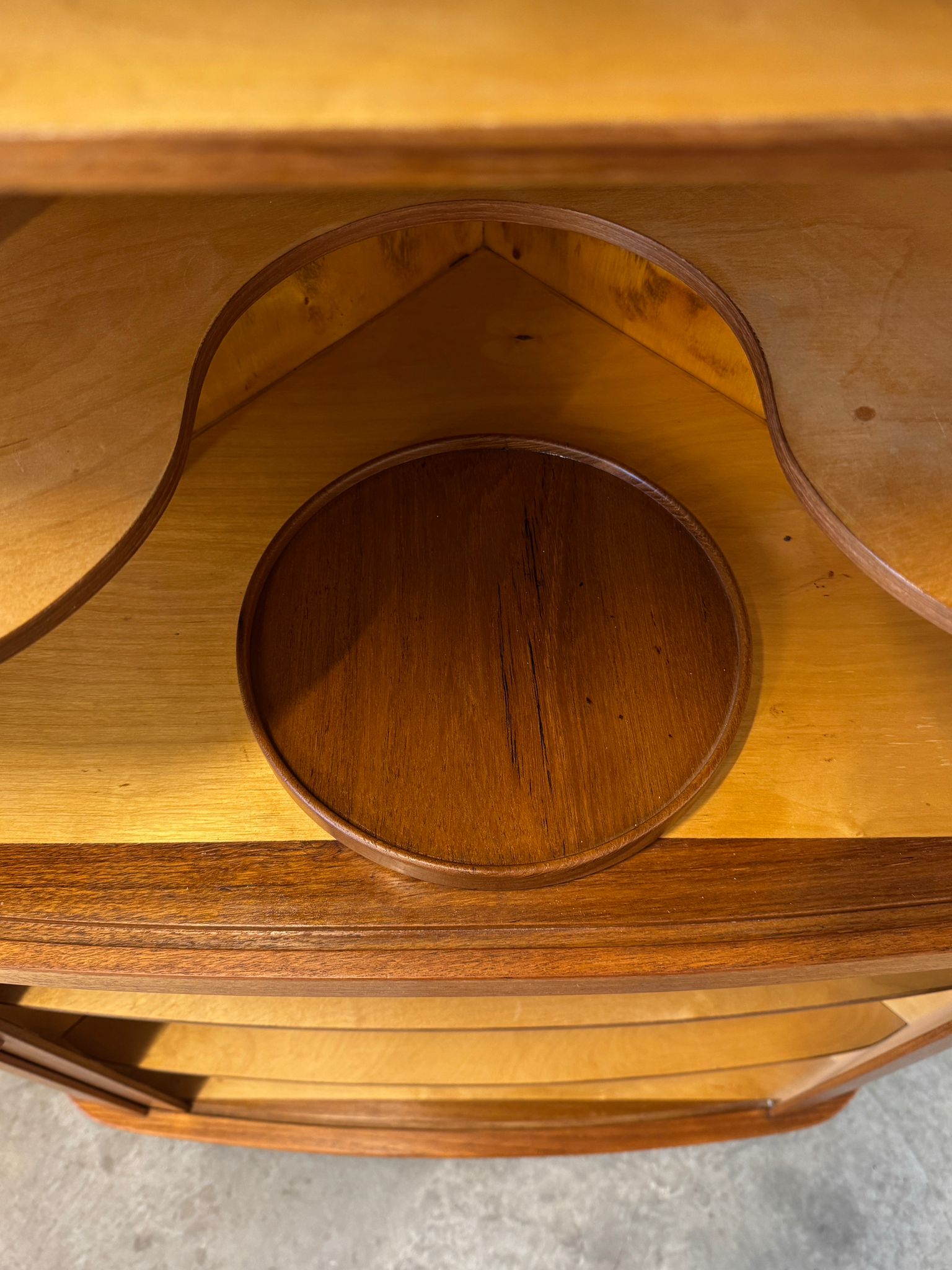 Details: This piece features tambour doors, a lazy susan, and tons of storage in a beautifully constructed & designed piece. Arne Hovmand Olsen worked for many of the major Danish furniture makers and operated his own shop for many years. This piece has a small repair to the back top and is priced accordingly.