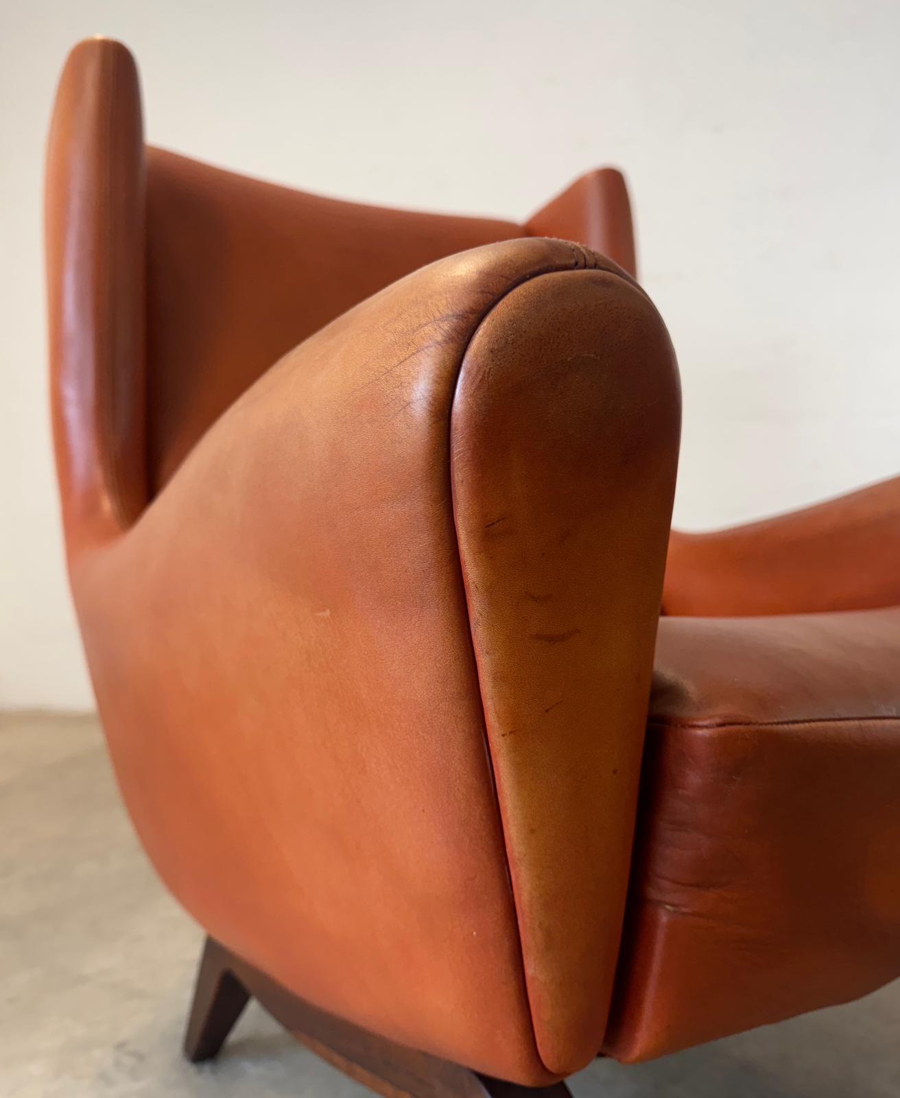 Details: This chair in cognac leather has solid rosewood legs. Wikkelsø (1919-1999) started his own company and worked with various companies starting in 1943. His many chair designs are what he is best known for. This wingback chair