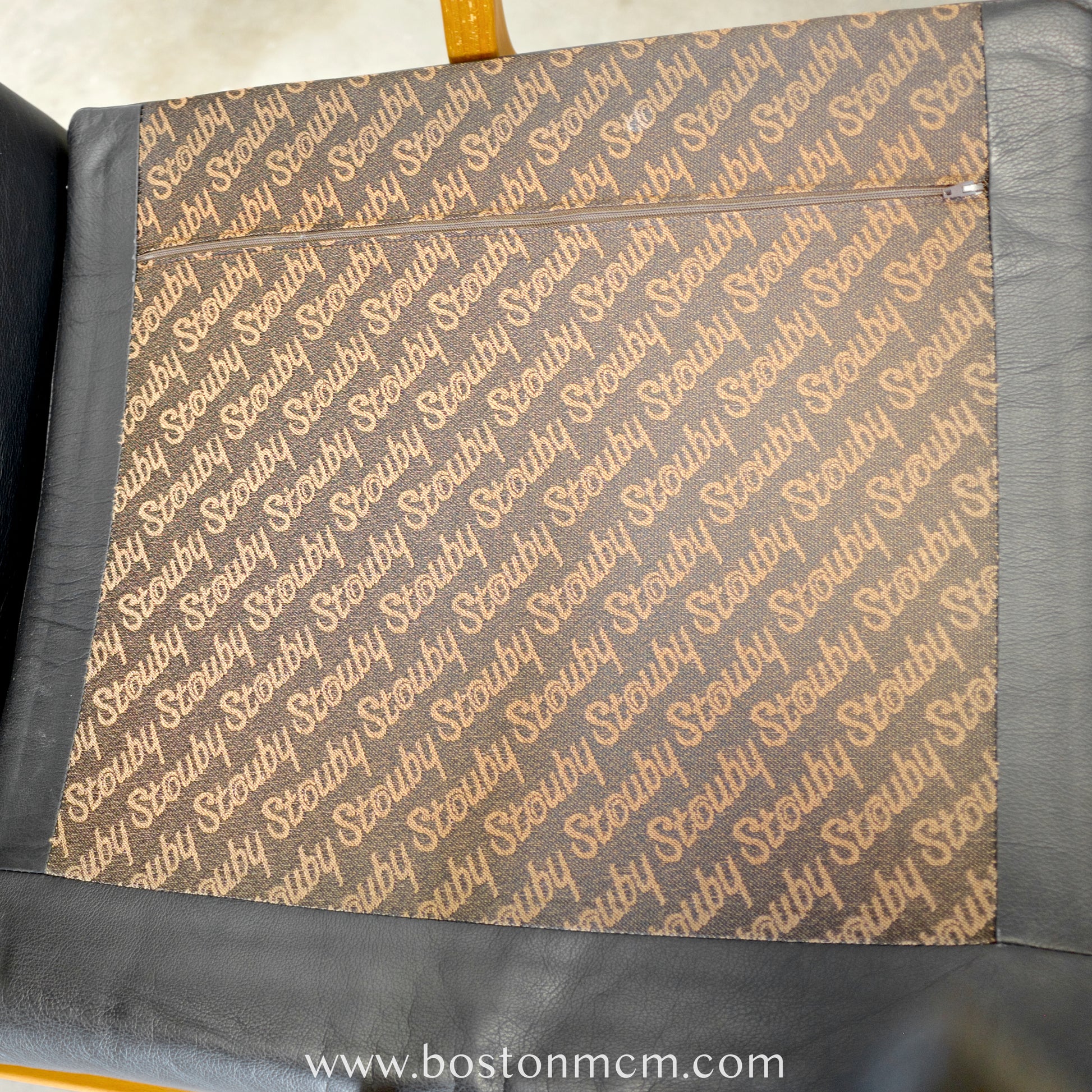 Details: This chair with leather cushions was produced by Stouby and made in the style of the Kvist Møbler “Albert” Armchair, which was designed by Finn Østergaard. The designer and precise year is unknown.