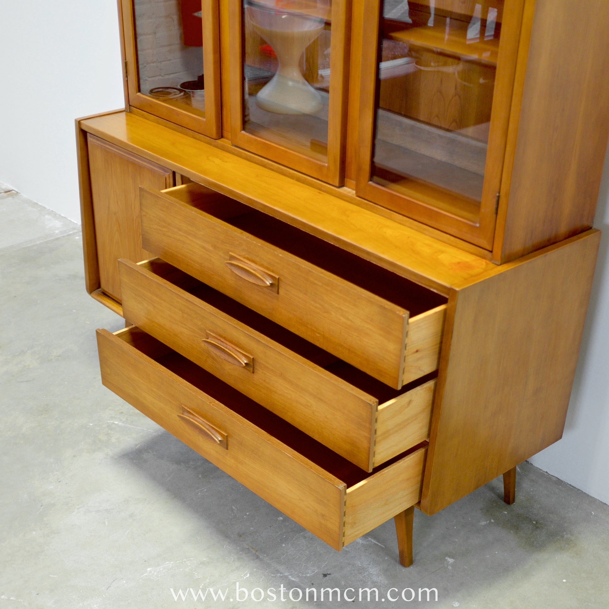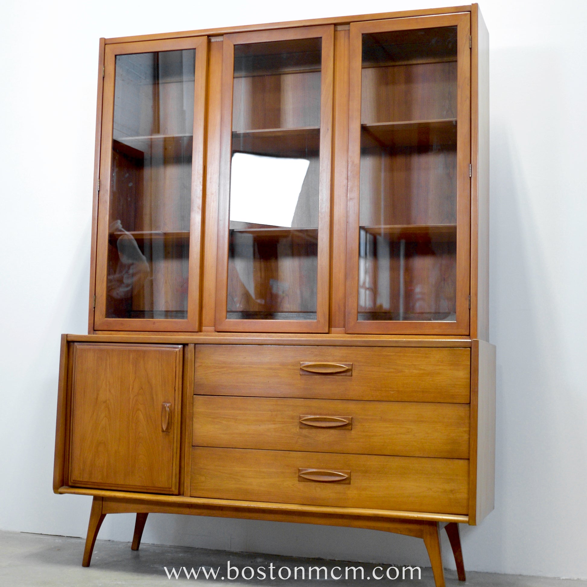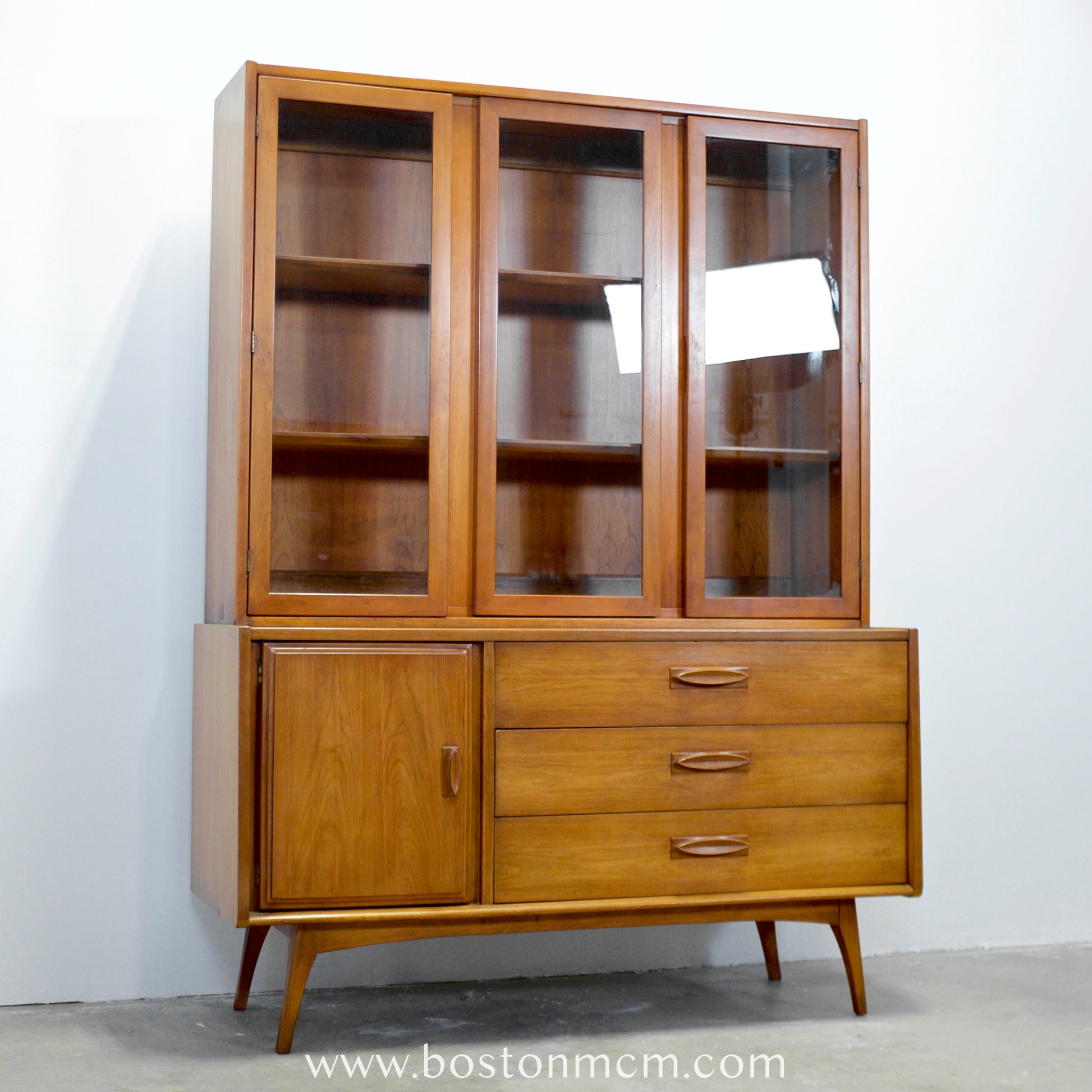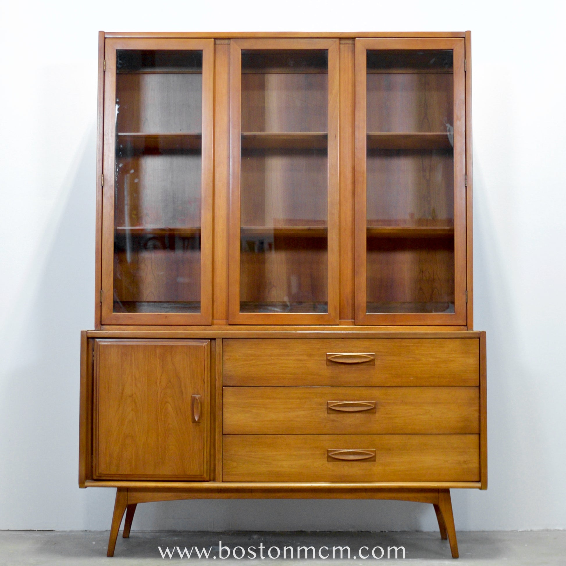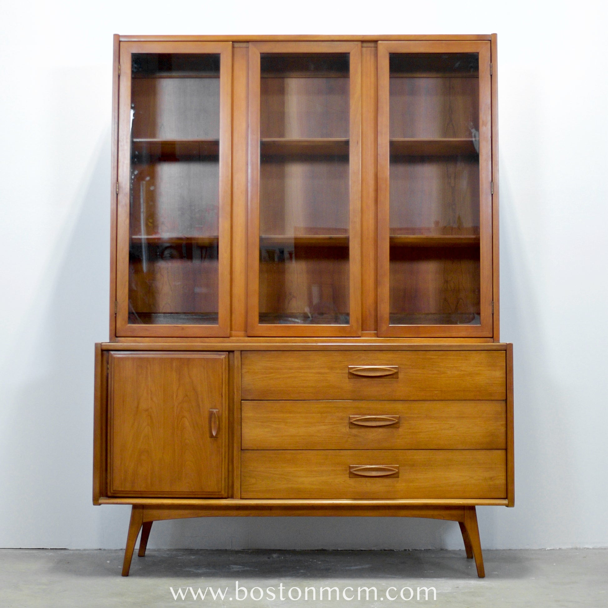 This hutch (credenza and top are separate pieces) is by United Furniture, for their "Intermood" line. Cherry wood, uncommon in mid century design, is used beautifully here, with graceful curves and angles throughout. The tapered legs are angled, the stretcher has a beautiful curve, and there are sculpted solid wood handles.