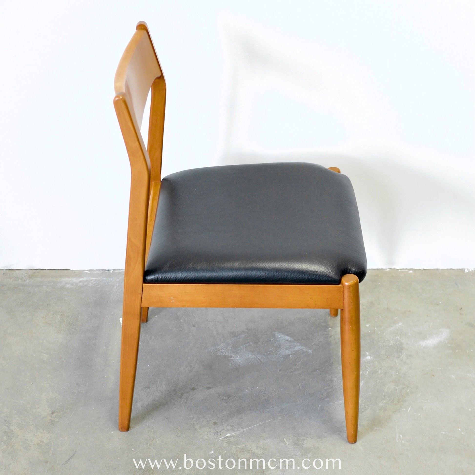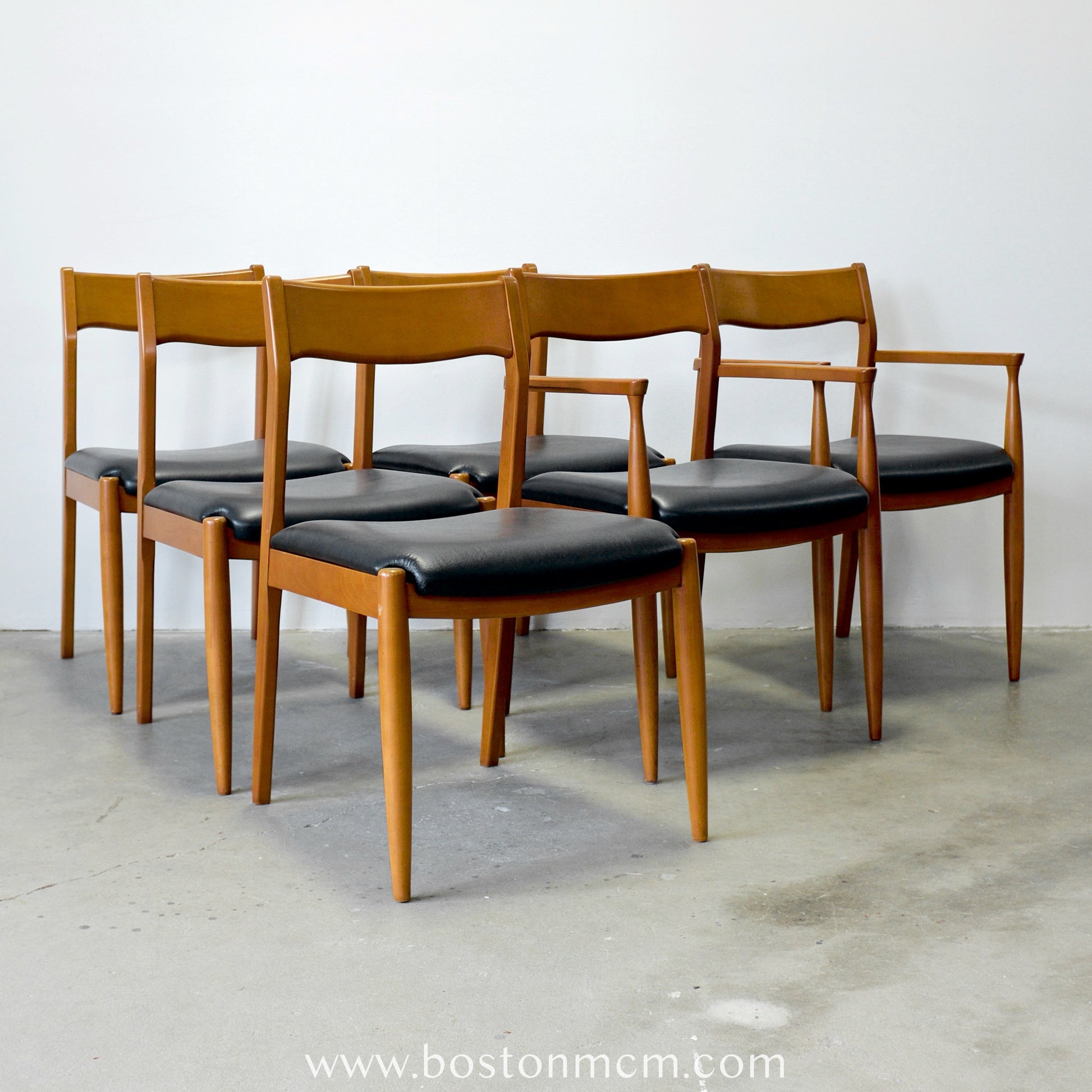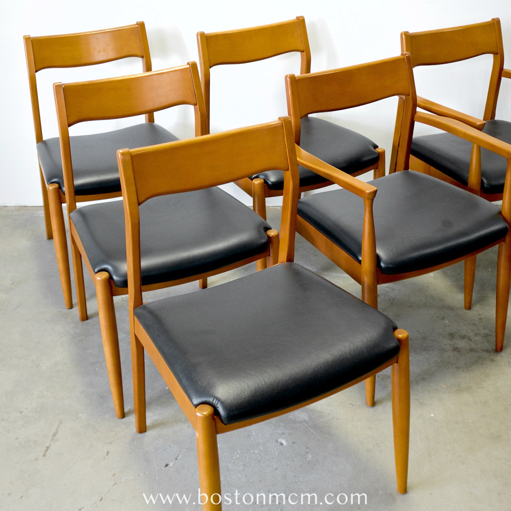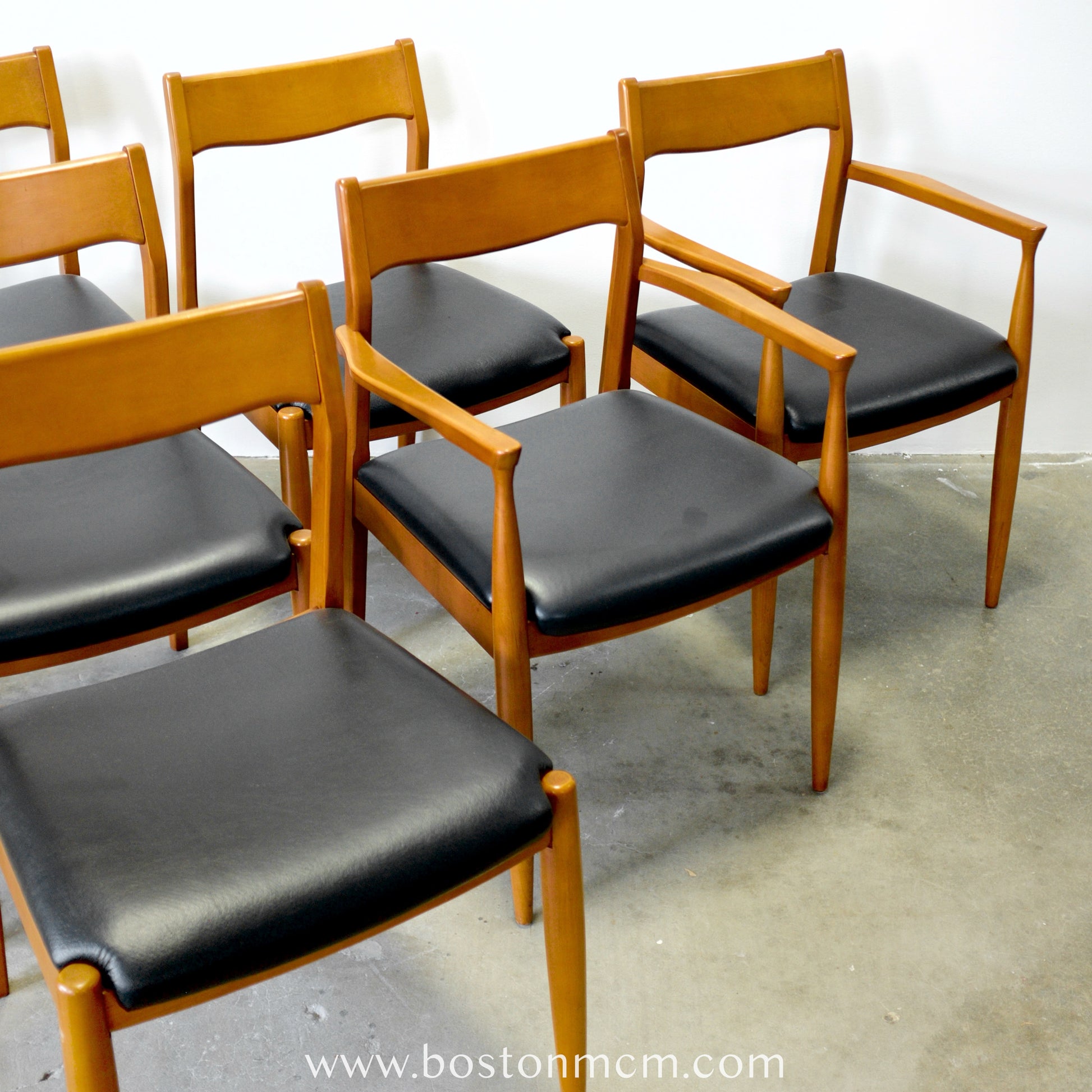 This set of six dining chairs is by United Furniture, from their uncommon "Intermood" line. Constructed of cherry, these chairs have been professionally restored and reupholstered with new black vinyl upholstery. Two armchairs and four side chairs included. We have another set of 4 matching chairs if you are looking for a larger set!