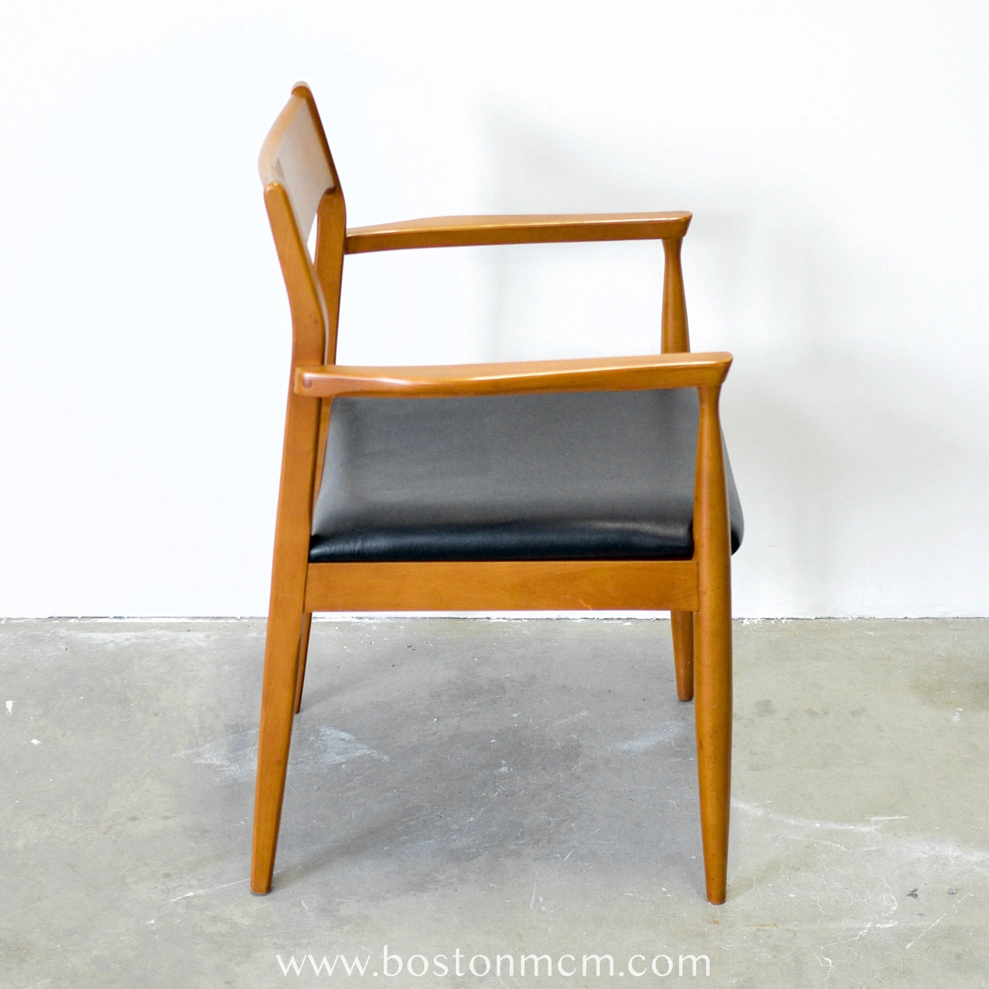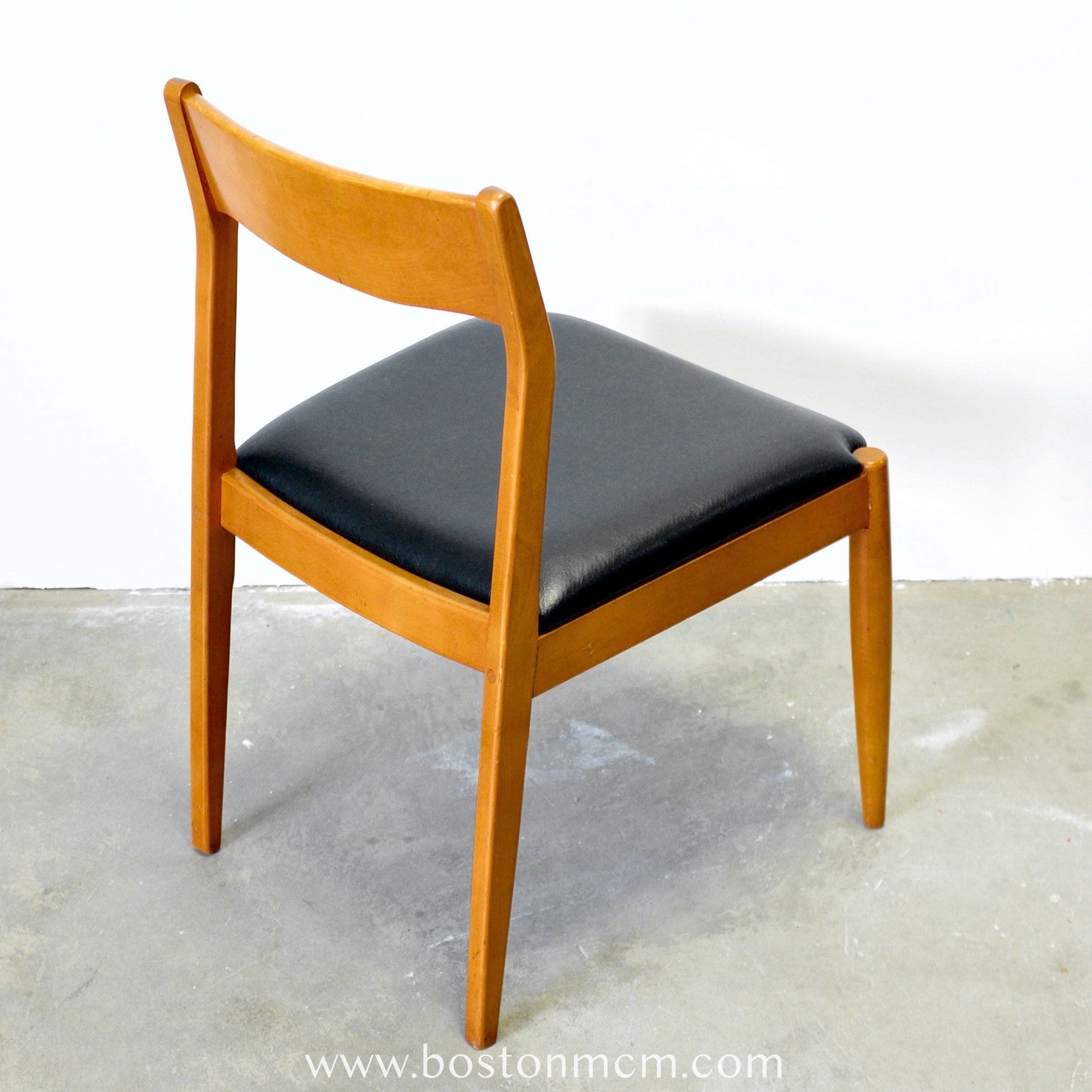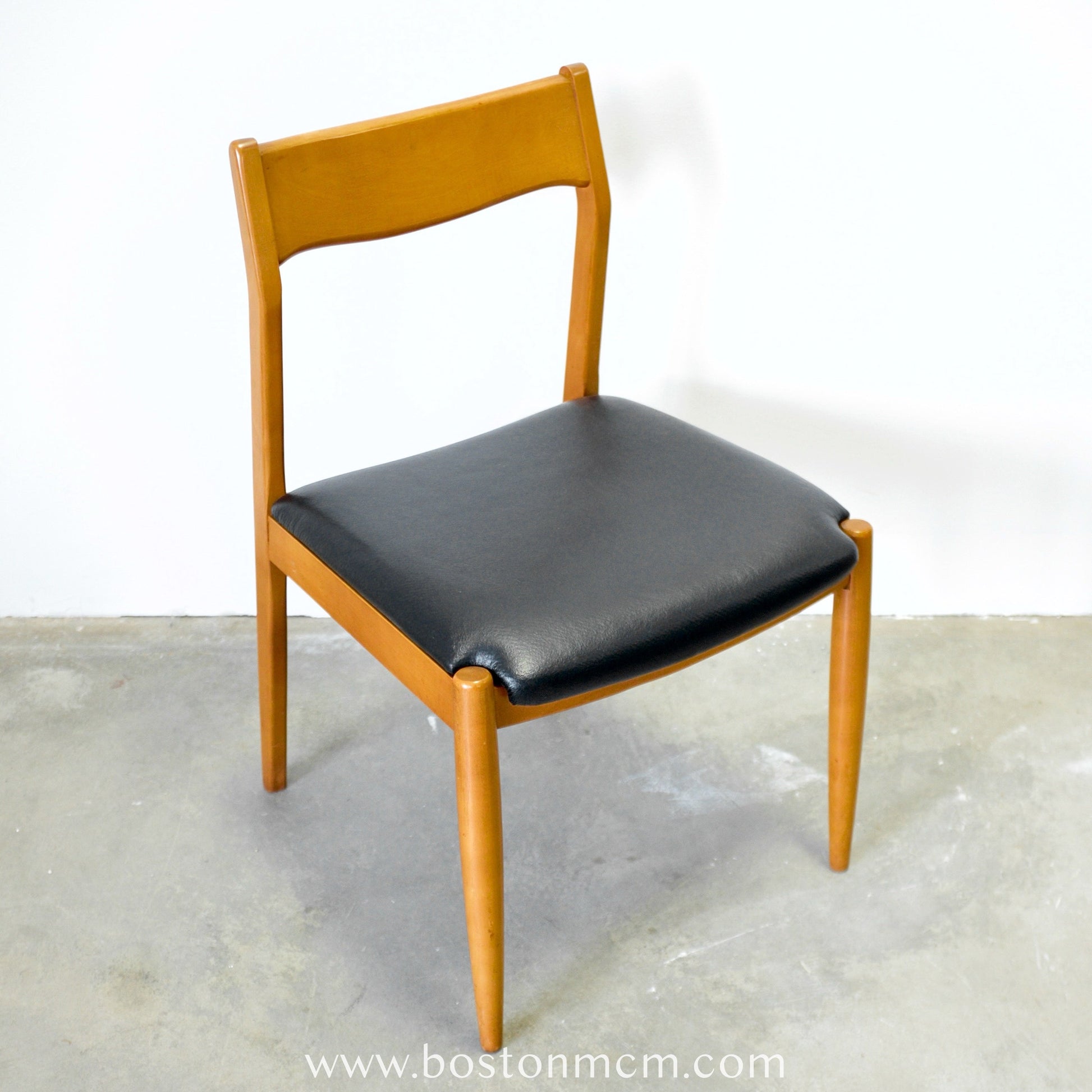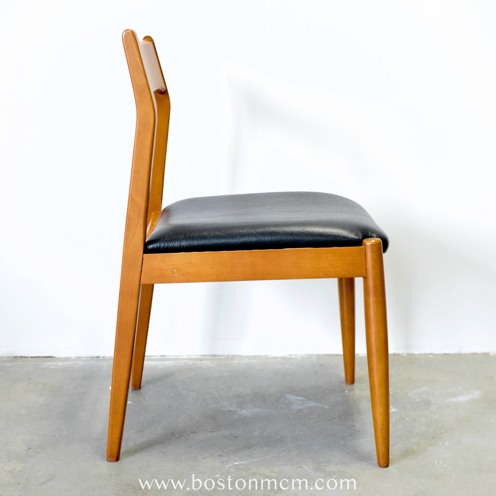 This set of six dining chairs is by United Furniture, from their uncommon "Intermood" line. Constructed of cherry, these chairs have been professionally restored and reupholstered with new black vinyl upholstery. Two armchairs and four side chairs included. We have another set of 4 matching chairs if you are looking for a larger set!