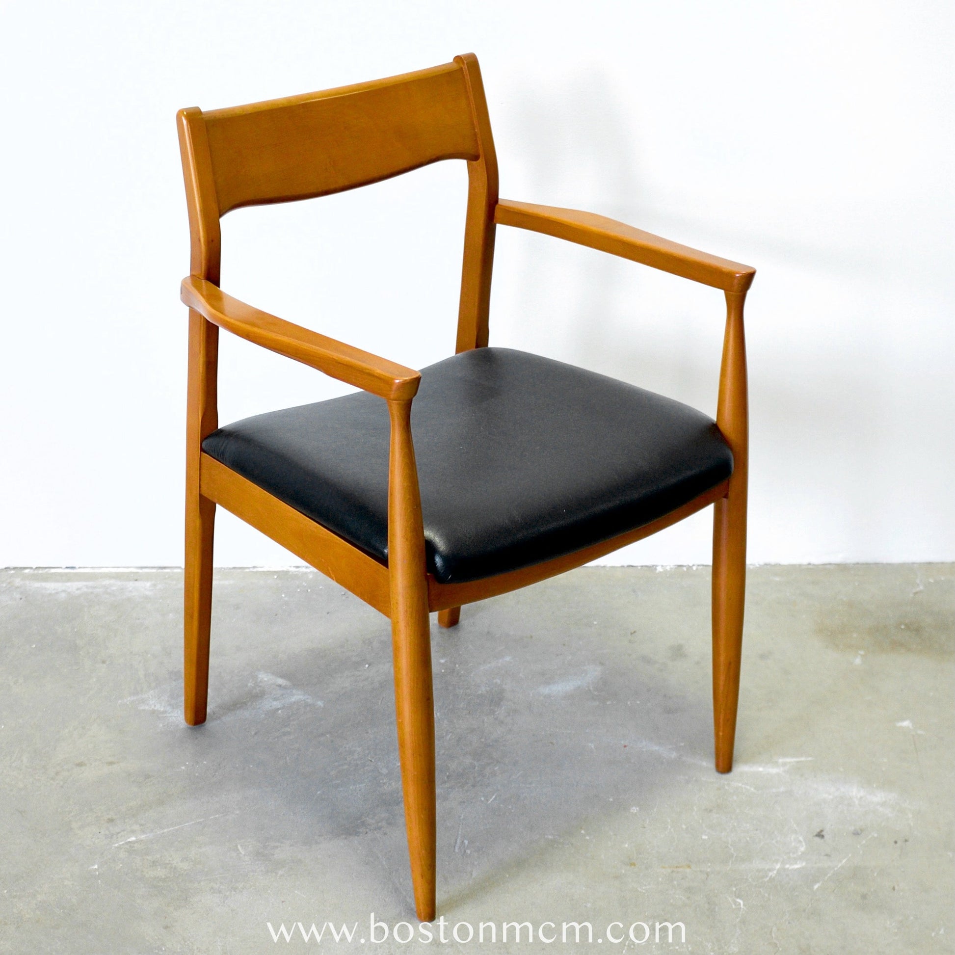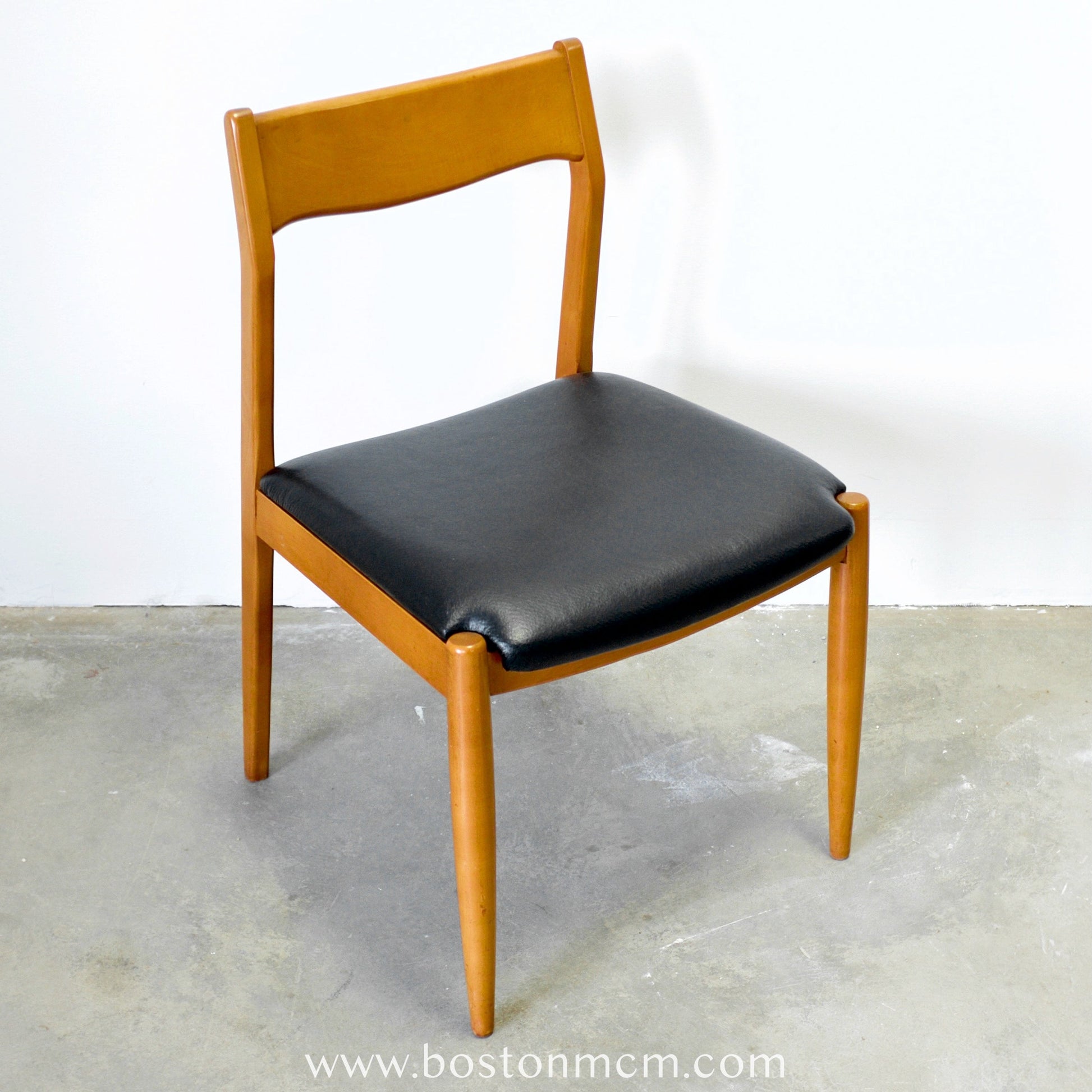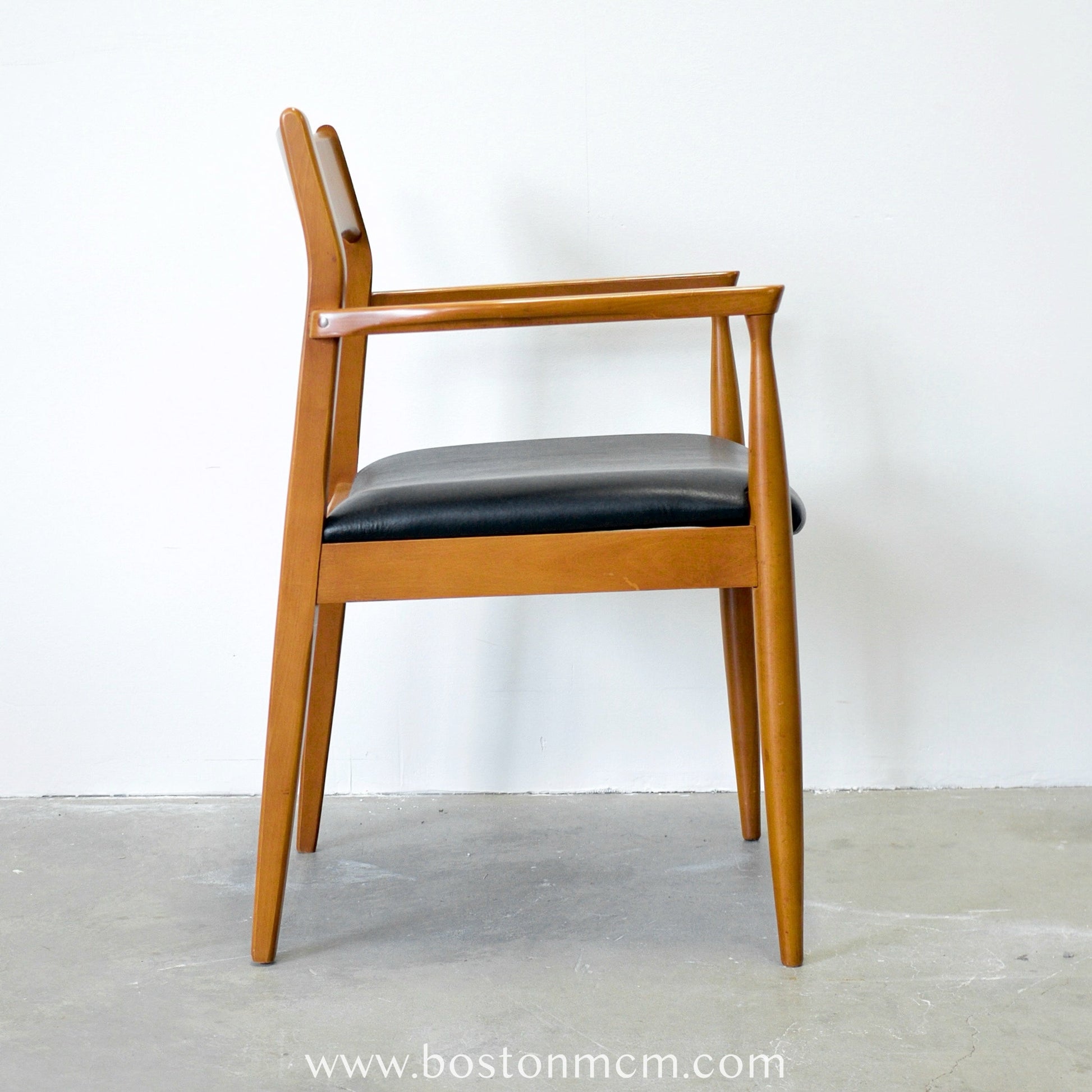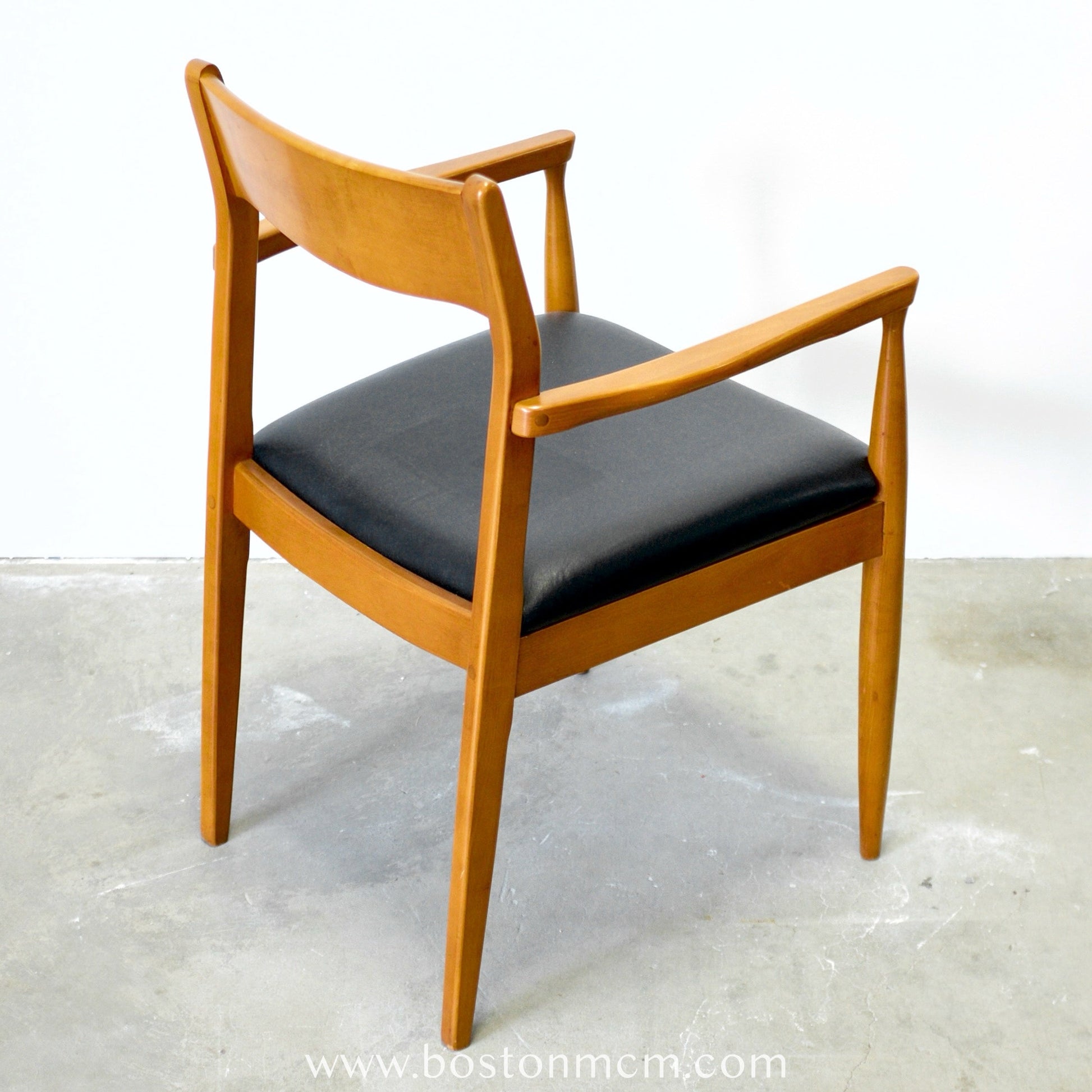 This set of six dining chairs is by United Furniture, from their uncommon "Intermood" line. Constructed of cherry, these chairs have been professionally restored and reupholstered with new black vinyl upholstery. Two armchairs and four side chairs included. We have another set of 4 matching chairs if you are looking for a larger set!